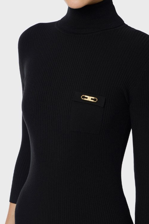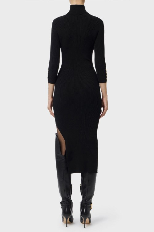 Детали: Женское черное трикотажное платье от Elisabetta Franchi (Елизабетта Франчи). Модель с примесью шелка, дизайн в рубчик, высокая горловина, нашивка с логотипом на груди, облегающий фасон, укороченный рукав, разрез сбоку, длина-миди