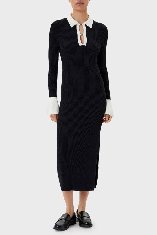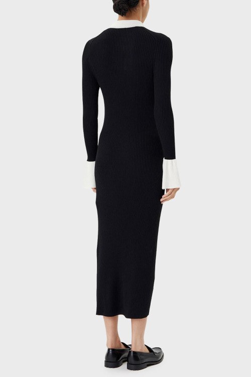 Детали: Женское черное трикотажное платье Sharry от Hugo by Hugo Boss (Хуго бай Хуго Босс). Дизайн в рубчик, отложной воротник, вырез соединен брендовой фурнитурой, расклешенные манжеты, облегающий силуэт, разрез сбоку, длина-миди