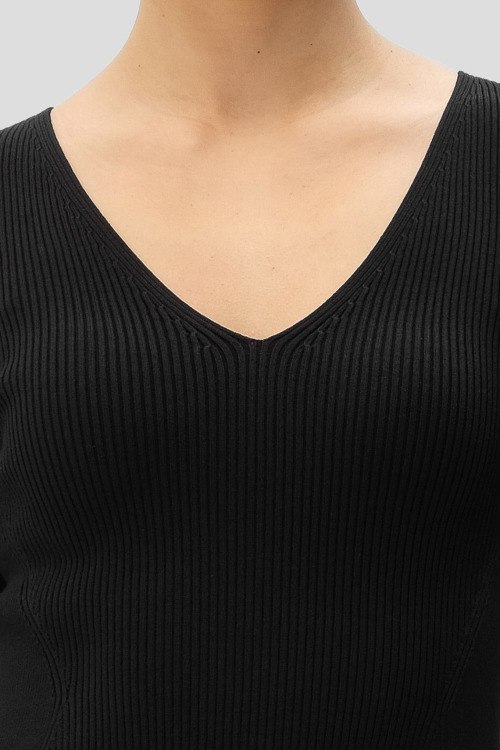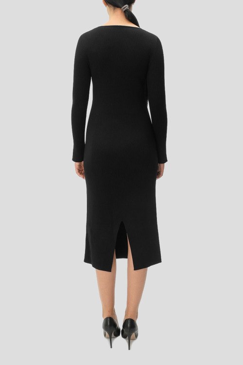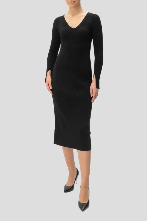 Детали: Женское черное платье из вискозного микса от Hugo Boss (Хуго Босс). Длина миди, приталенный силуэт, дизайн в рубчик, длинные рукава, V-образный вырез горловины, ровный подол, сзади разрез