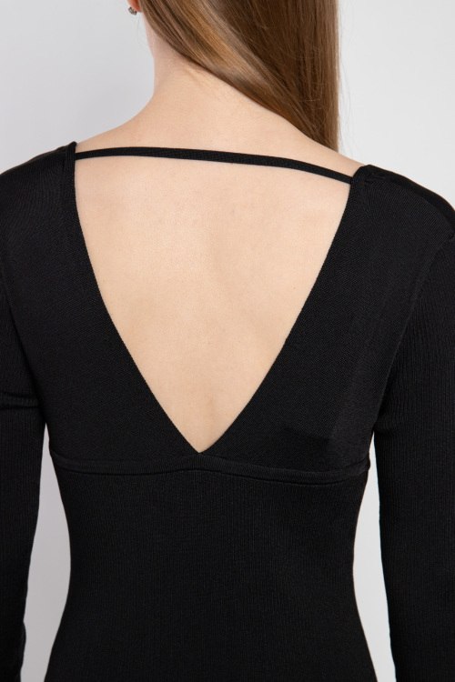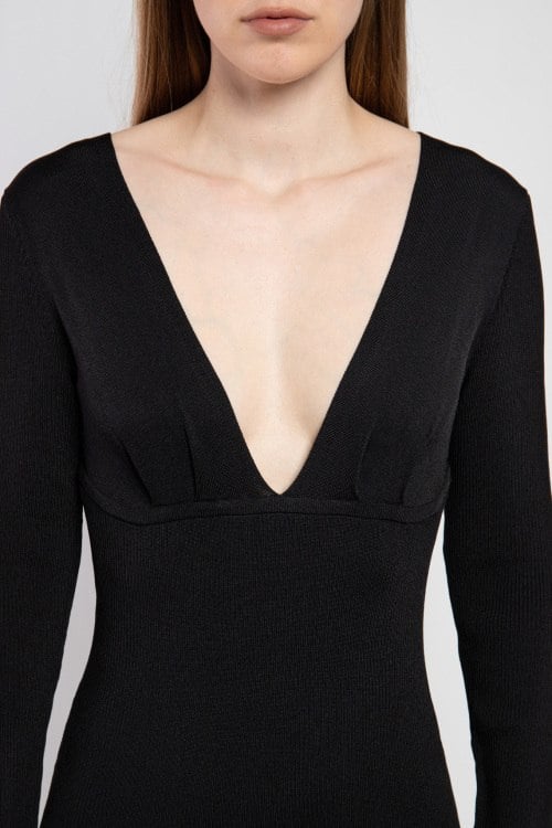 Женское черное платье из вискозы от Pinko (Пинко). Дизайн в рубчик, глубокий V-образный вырез спереди и сзади, длинный рукав, облегающий фасон, длина-миди