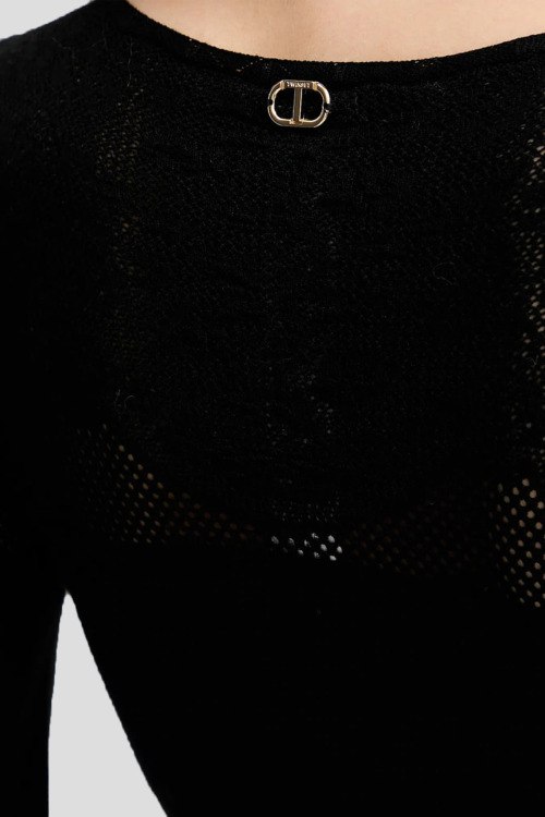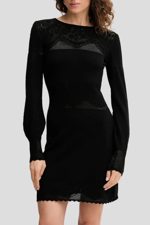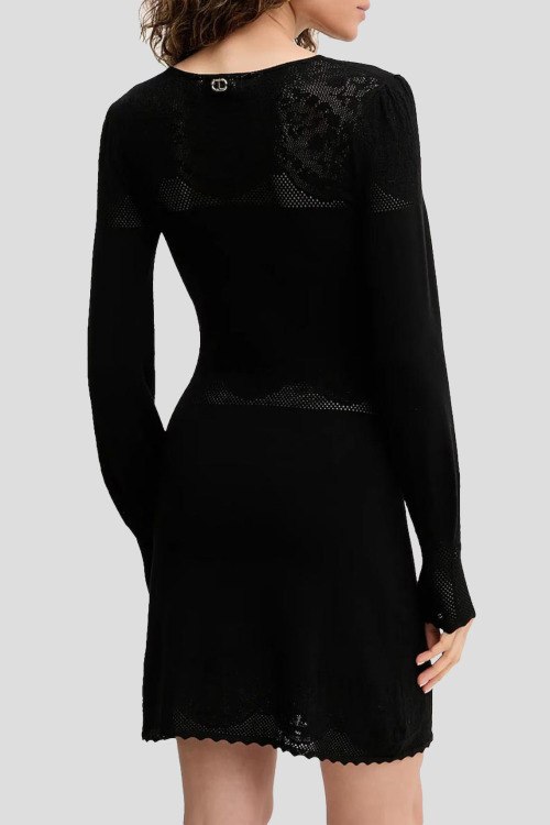 Детали: Женское черное трикотажное платье от TWINSET (Твинсет). Комбинированная вязка, вырез горловины-лодочка, длинный рукав, короткая длина