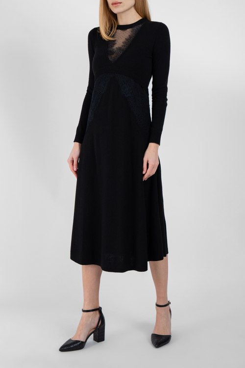 Женское черное платье из микса вискозы и шерсти от TWINSET (Твинсет). Длина миди, приталенный силуэт, круглый вырез горловины, гипюровая вставка в зоне декольте, длинные рукава, расклешенная юбка, ровный подол, металлический логотип бренда