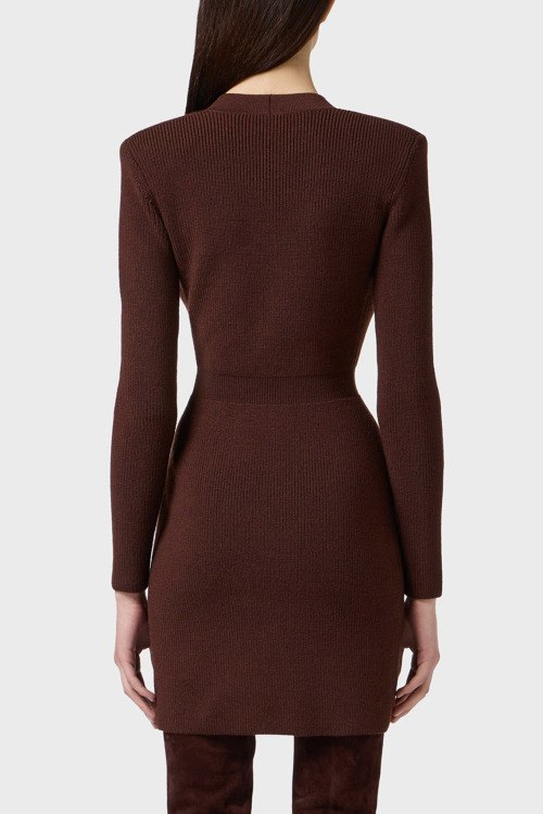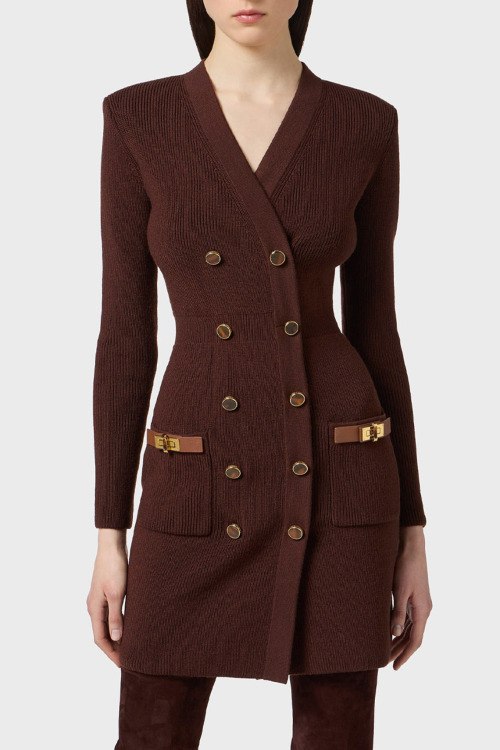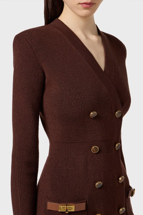 Детали: Женское темно-коричневое платье из шерсти и акрила от Elisabetta Franchi (Елизабетта Франчи). Дизайн в рубчик, двубортный фасон, облегающий фасон, V-образный вырез, длинный рукав, два накладных кармана, застежка на пуговицы, короткая длина