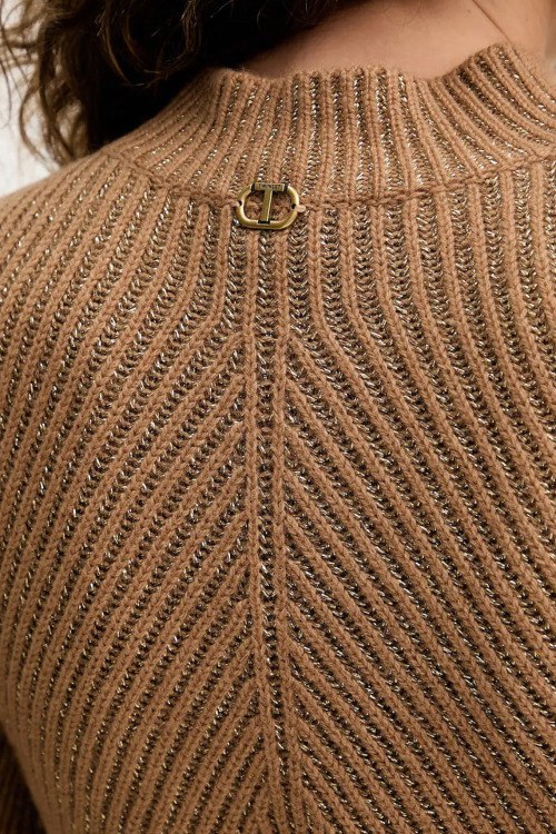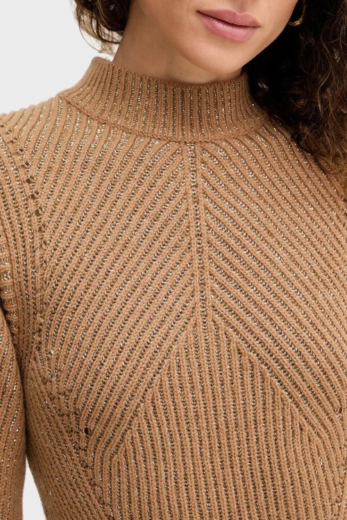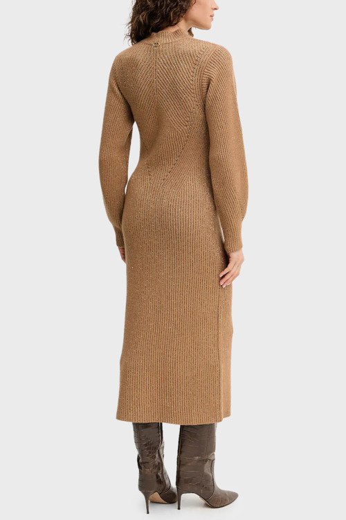 Детали: Женское трикотажное платье цвета кэмел от TWINSET (Твинсет). Модель с примесью шерсти и кашемира, декор люрексом, воротник-стойка, длинный рукав, длина-миди