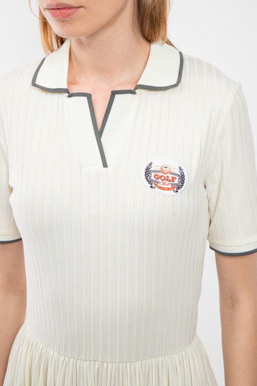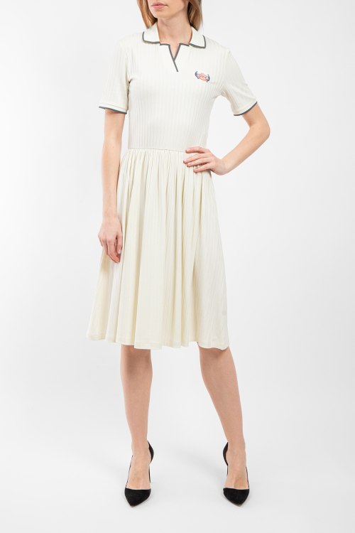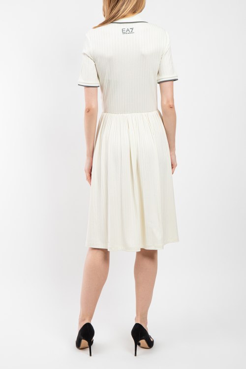 Женское платье молочного оттенка из вискозы и полиамида от EA7 Emporio Armani (ЕА7 Эмпорио Армани). Дизайн в рубчик, короткие рукава, классический воротник, V-образный вырез горловины, приталенный силуэт, расклешенная юбка, ровный подол, патч-лого на груди.