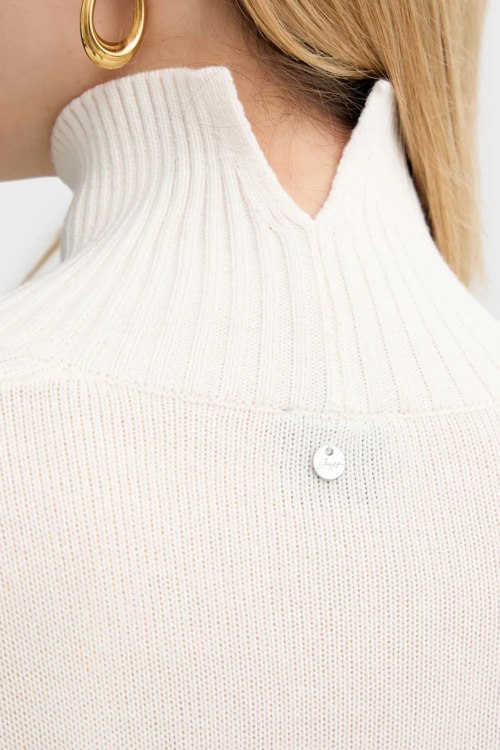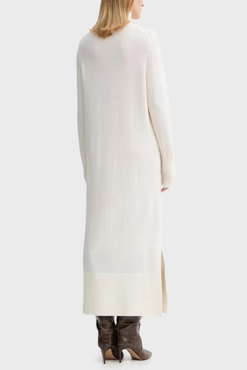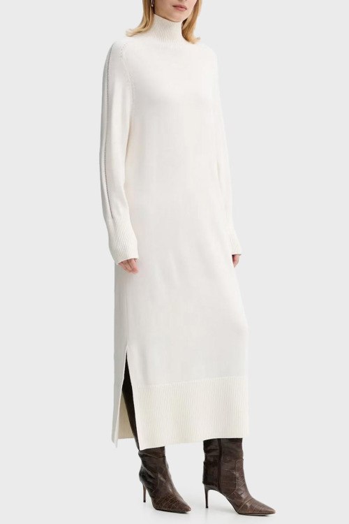 Детали: Женское шерстяное платье молочного оттенка Fagliatelle от Hugo Boss (Хуго Босс). Высокая горловина, свободный силуэт, разрезы по бокам, длинный рукав