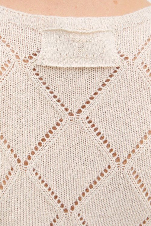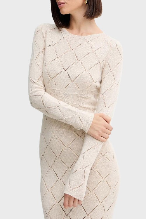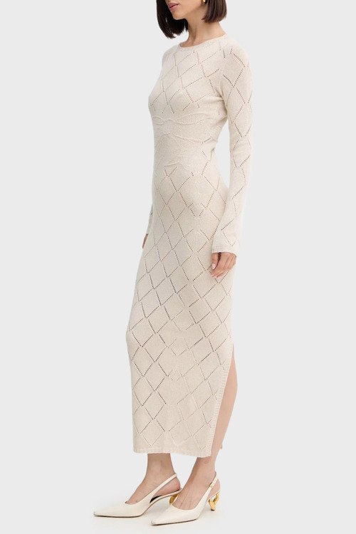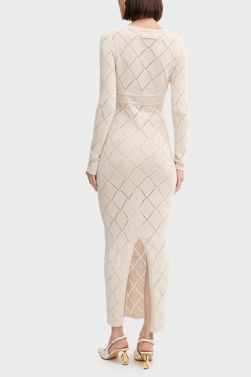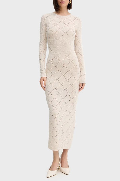 Детали: Женское кремовое платье с примесью шерсти от TWINSET (Твинсет). Облегающий фасон, ажурный узор по всей поверхности, круглый вырез горловины, длинный рукав, длина-макси