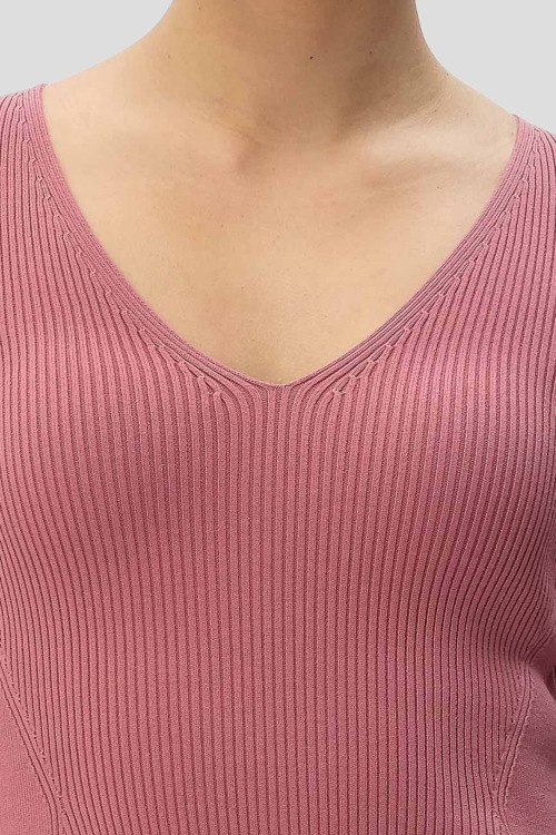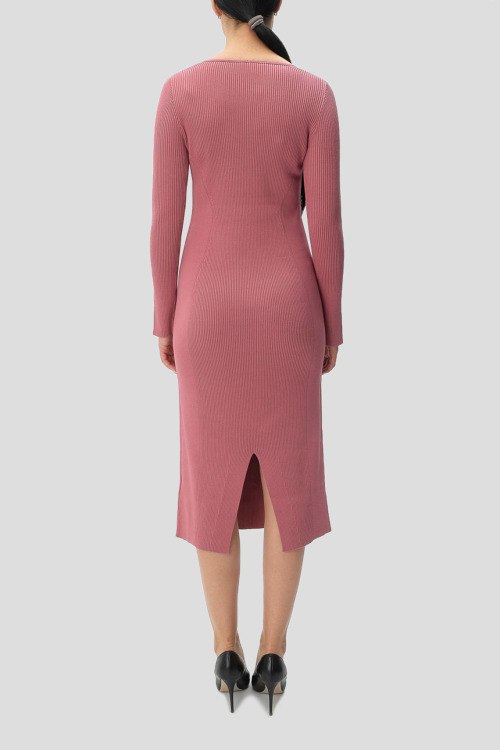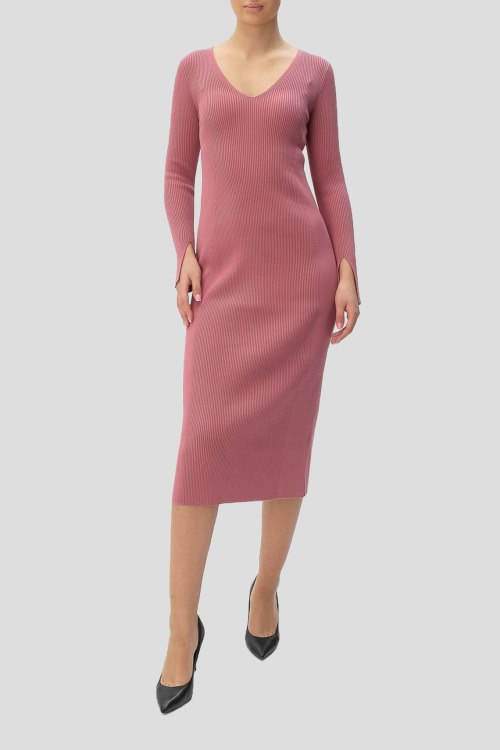 Детали: Женское розовое платье из вискозного микса от Hugo Boss (Хуго Босс). Длина миди, приталенный силуэт, дизайн в рубчик, длинные рукава, V-образный вырез горловины, ровный подол, сзади разрез
