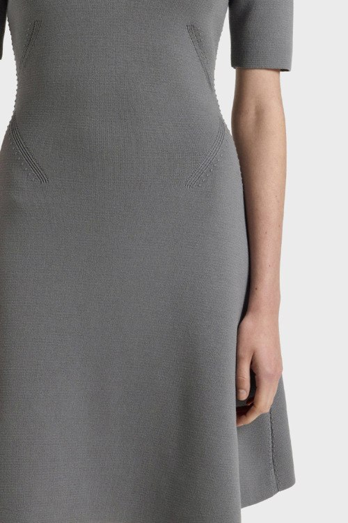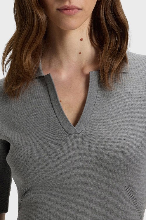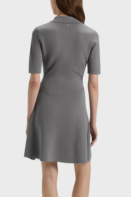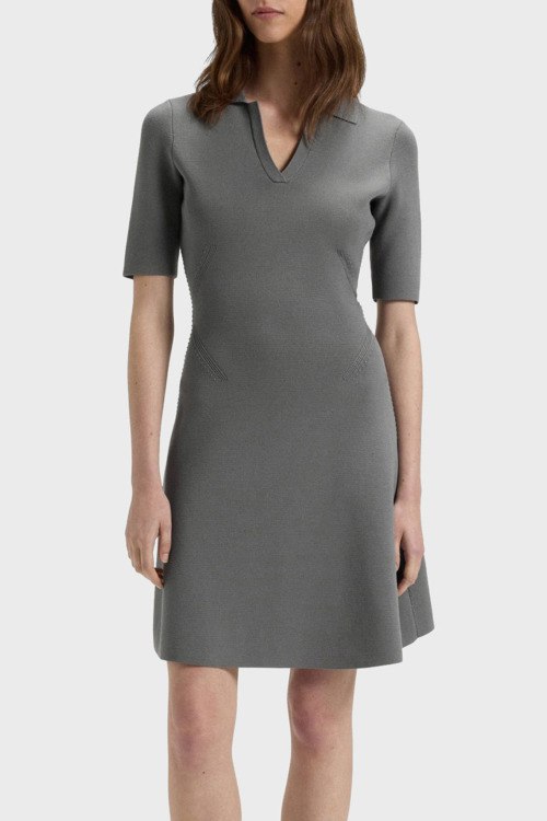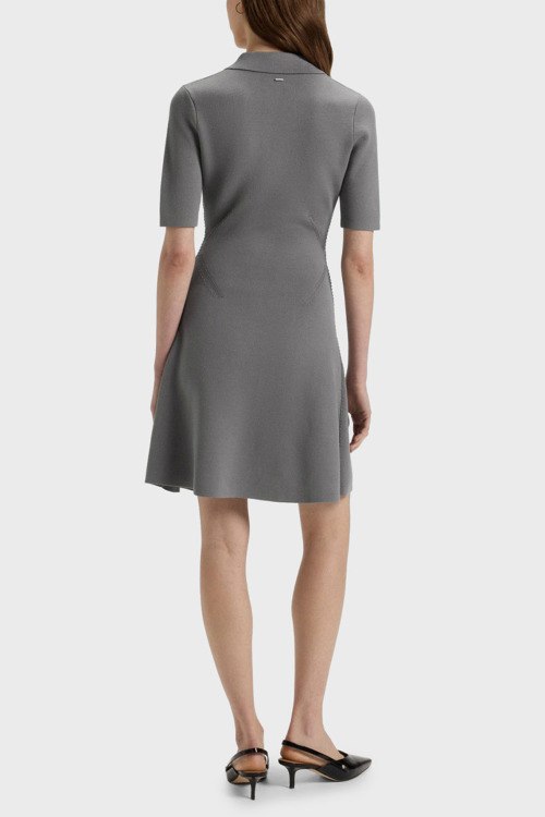 Детали: Женское серое трикотажное платье-поло Felita от Hugo Boss (Хуго Босс). Отложной воротник, V-образный вырез, короткий рукав, короткая длина