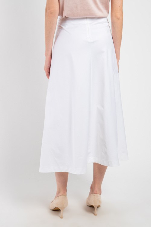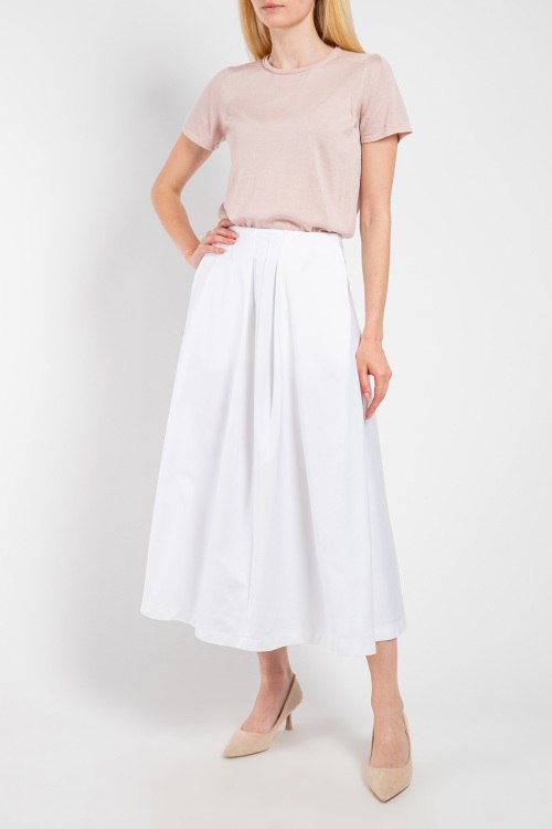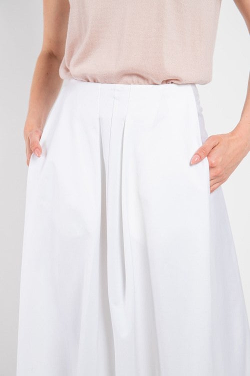 Детали: Женская белая юбка из хлопка от Bilancioni (Биланчиони). Длина - миди, средняя посадка пояса, застежка на потайную молнию, прорезные карманы по бокам, защипы спереди