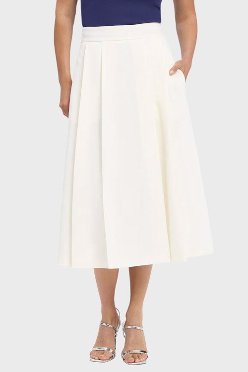 Детали: Женская белая юбка-миди Romila от Hugo by Hugo Boss (Хуго бай Хуго Босс). Дизайн в крупную складку, боковые карманы, застежка-молния сзади, длина-миди