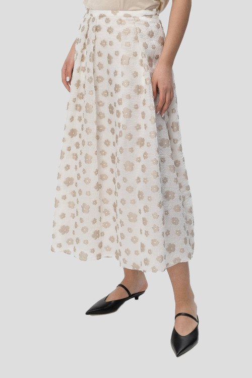 Детали: Женская белая юбка из полиамида и полиэстера от Emporio Armani (Эмпорио Армани). Длина миди, высокая посадка, застежка на молнию сбоку, цветочный принт по всей поверхности изделия, ровный подол