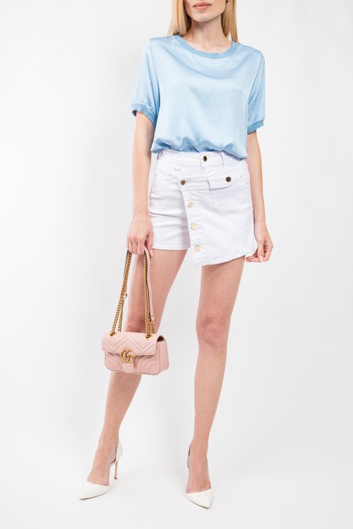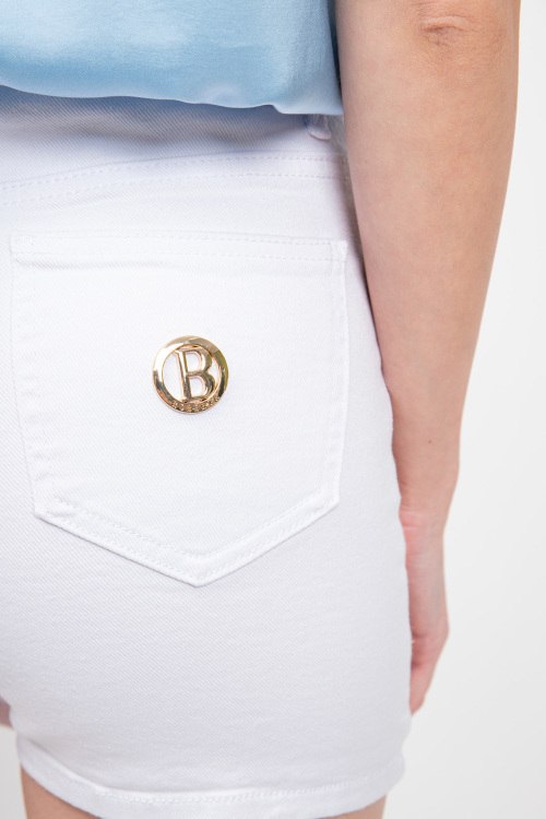 Женская белая джинсовая юбка-шорты от Roberta Biagi (Роберта Бьяджи). Пяти-карманная модель, пояс с петлями для ремня, значок с логотипом на заднем кармане, асимметричная застежка на пуговицы, длина-мини. Размер вещи на фото: 40, длина: 36 см, ширина штанины вверху: 26 см, ширина по поясу: 36 см, ширина по бёдрам: 37 см, высота сидения: 32 см.