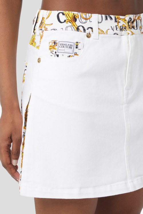 Детали: Женская белая джинсовая юбка Jeans Couture из хлопкового микса от Versace (Версаче). Короткая длина, высокая посадка, застежка на молнию и пуговицу, четыре кармана, петли в поясе для ремня, брендированные вставки, ровный подол