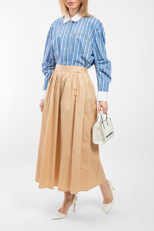 Женская бежевая юбка из хлопка от Liu Jo (Лиу Джо). Длина миди, высокая посадка, застежка на молнию сбоку, эластичная резинка на поясе, расклешенная модель, ровный подол.