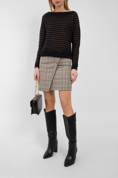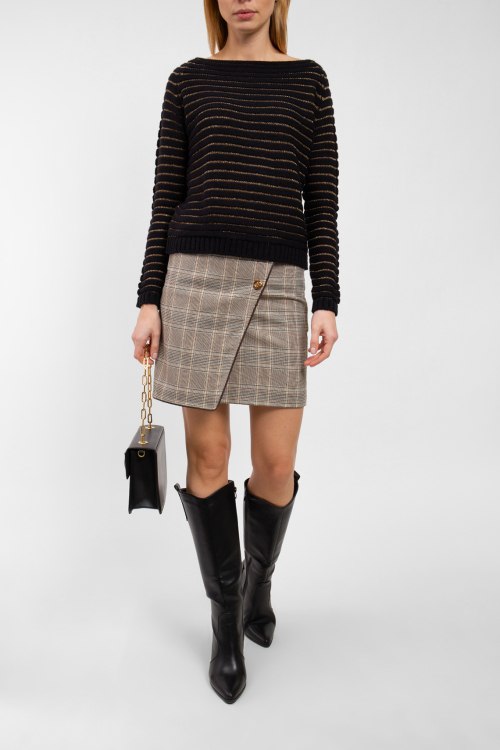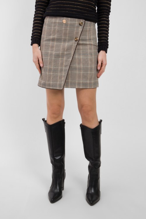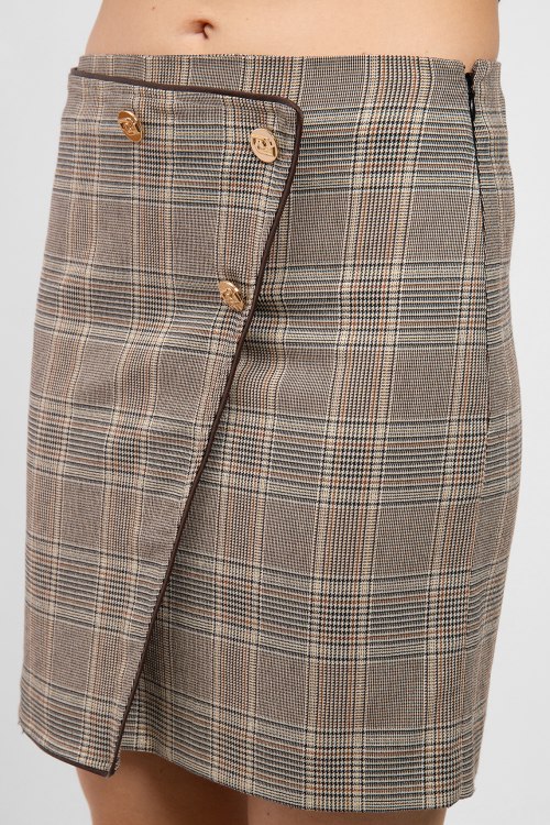 Женская бежевая юбка из вискозы от Liu Jo (Лиу Джо). Модель на запах, клетка по всей поверхности, золотистые пуговицы, застежка-молния сбоку, короткая длина.