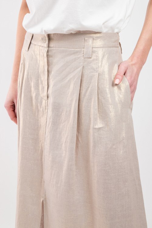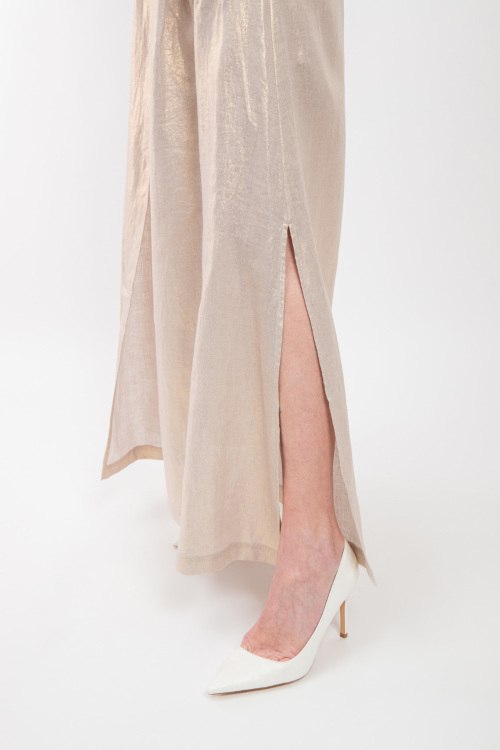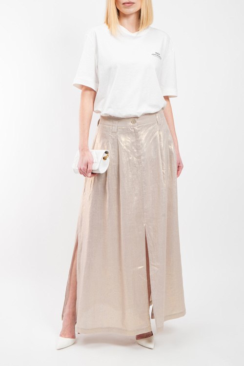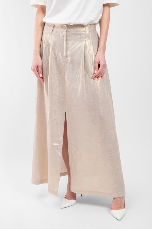 Женская бежевая юбка из льна от Panicale Cashmere (Паникале Кашемир). Длина макси, высокая посадка, застежка на молнию и пуговицу, прорезные карманы, по бокам и спереди разрезы. Замеры для размера 44: длина: 103 см, ширина по талии (резинка): 36,5 см, ширина по бедрам: 56 см.