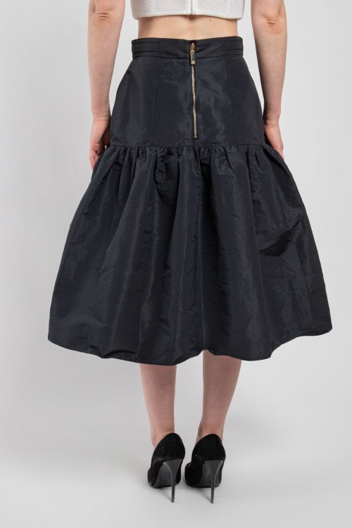 Детали: Женская черная юбка от Elisabetta Franchi (Елизабетта Франчи). Длина миди, пышный фасон, накладные карманы, металлический золотистый логотип бренда на поясе