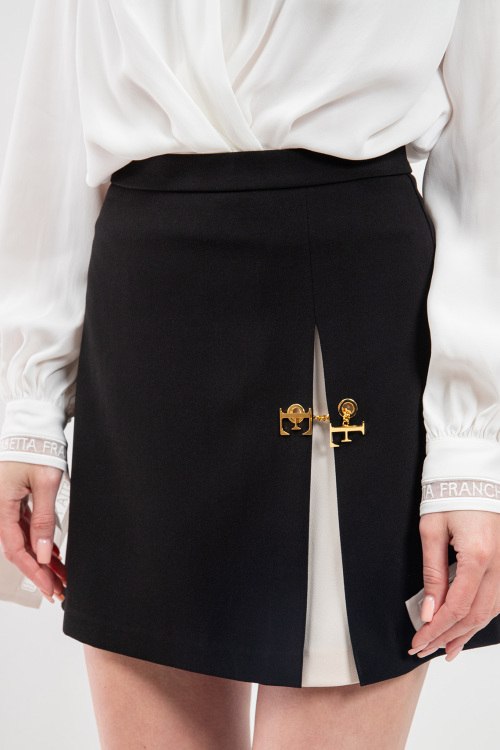 Женская черная юбка от Elisabetta Franchi (Елизабетта Франчи). Белая вставка, золотистый логотип, застежка-молния сзади, длина-мини.