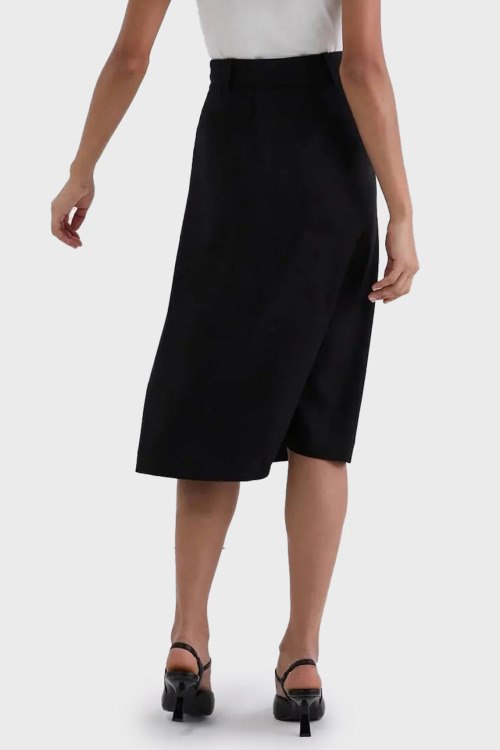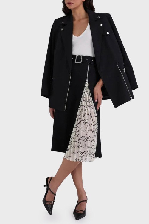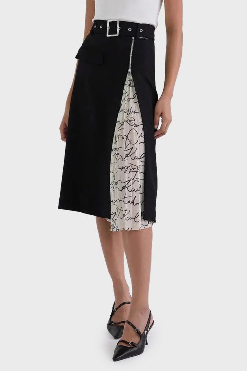 Черная терная трикотажная юбка от Karl Lagerfeld (Карл Лагерфельд). Пояс с металлической пряжкой, карман с клапаном, плиссированная вставка с принтом логотипа, длина-миди