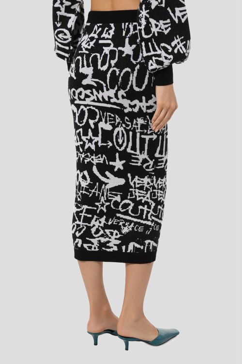 Детали: Женская черно-белая трикотажная юбка из вискозы и полиамида от Versace (Версаче). Длина миди, облегающий силуэт, высокая посадка, эластичная резинка на поясе, дизайн с брендированным принтом по всей поверхности изделия