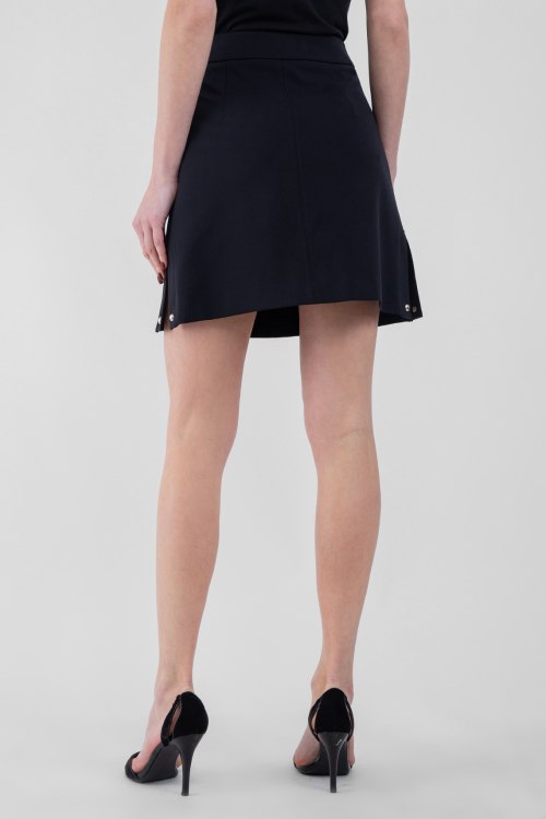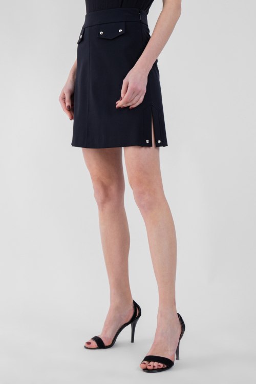 Женская черная юбка из вискозного микса от Pinko (Пинко). Модель А-силуэта, высокая посадка талии, застежка на молнию сбоку изделия, пластиковая фурнитура, боковые разрезы, карманы-обманки, ровный подол.