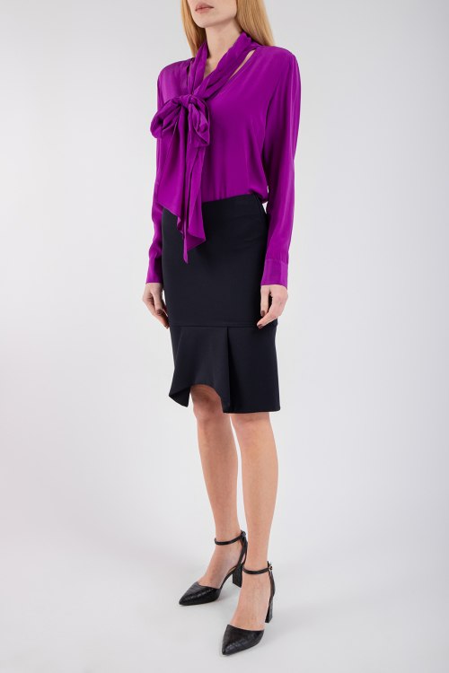Женская черная юбка из микса вискозы и шерсти от Space (Спейс). Высокая посадка, застежка на молнию, асимметричный низ изделия, длина до колена.