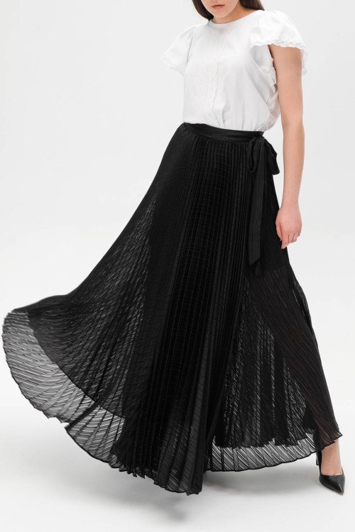 Женская черная юбка от TWINSET (Твинсет). Модель на запах, плиссированный дизайн, в поясе на завязках, значок с логотипом сзади, длина-макси