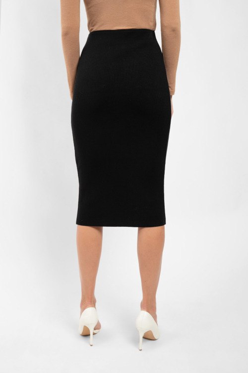 Женская черная юбка из вискозного микса от Vicolo (Виколо). Высокая посадка, эластичная резинка на поясе, облегающий силуэт, ровный низ изделия. Замеры для размера UNI: ширина по поясу: 33 см, ширина по бедрам: 35 см, длина: 75 см.