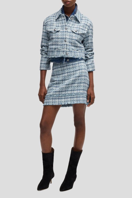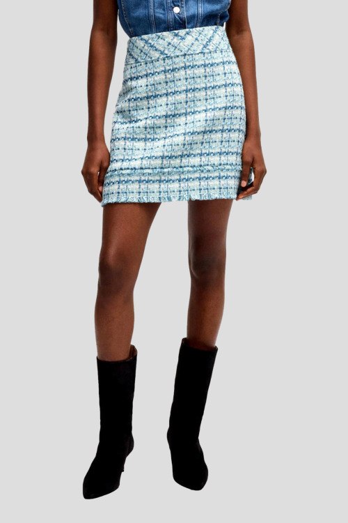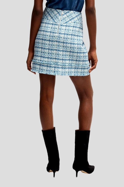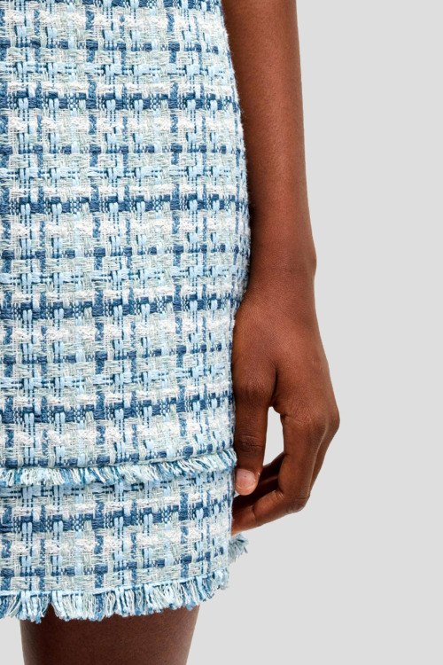 Детали: Женская голубая твидовая юбка Minirock от Hugo Boss (Хуго Босс). Высокая талия, застежка-молния сзади, нижний край с бахрамой, короткая длина