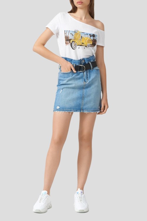 Детали: Женская голубая джинсовая юбка из хлопкового микса от Liu Jo (Лиу Джо). Короткая длина, высокая посадка, застежка на молнию и пуговицу, петли в поясе для ремня, прорезные карманы