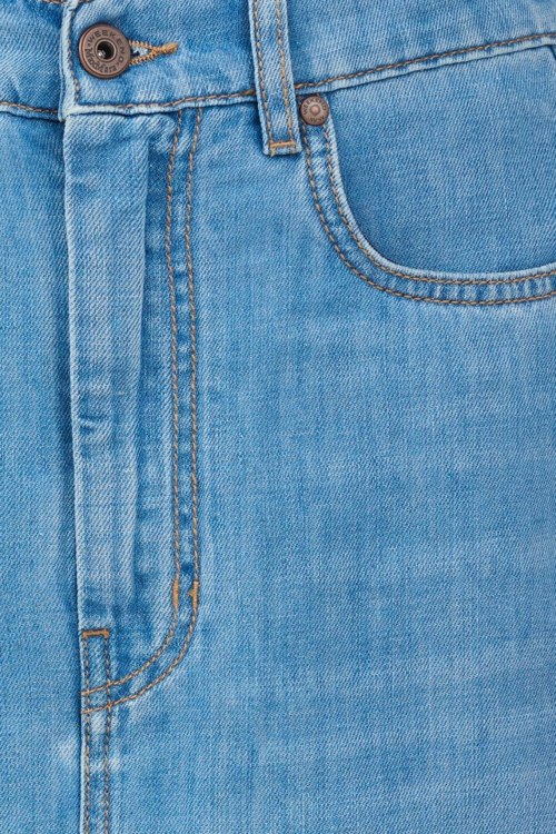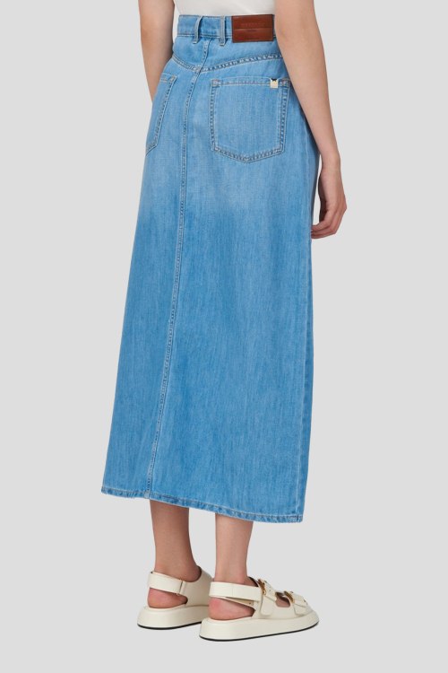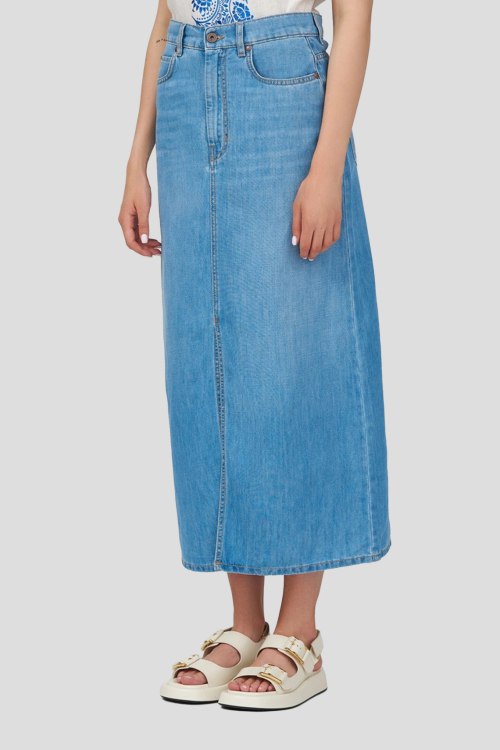 Детали: Женская гоулбая джинсовая юбка из микса льна и хлопка от Max Mara (Макс Мара). Длина миди, высокая посадка, застежка на молнию и пуговицу, прорезные карманы, петли в поясе для ремня, спереди разрез