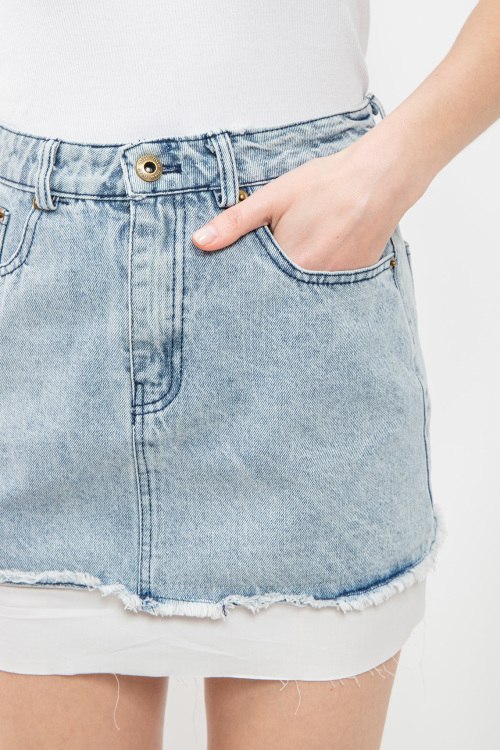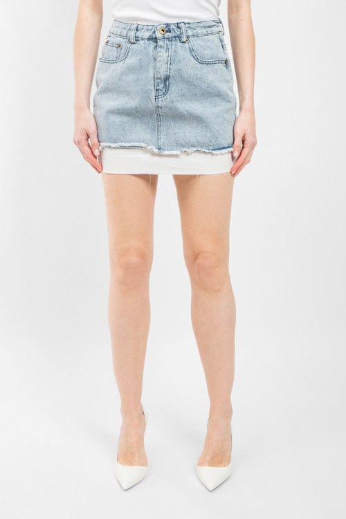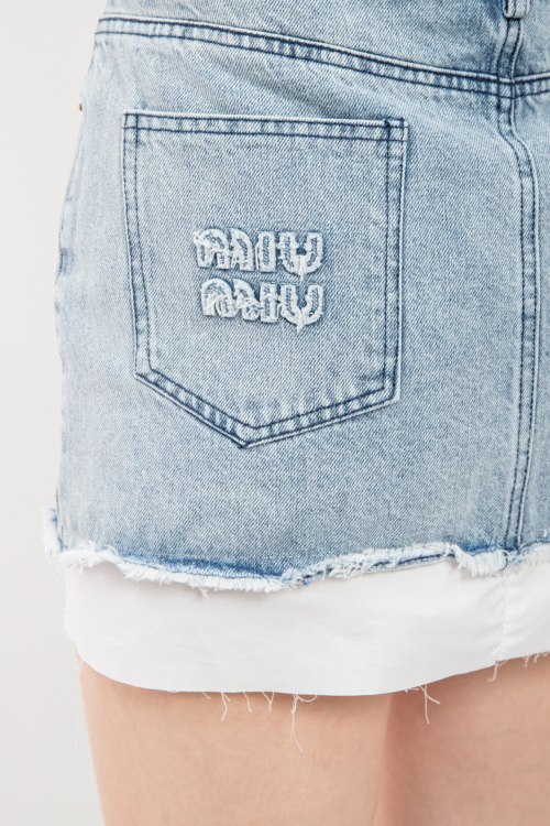 Женская голубая джинсовая юбка от Miu Miu (Миу Миу). Пяти-карманная модель, пояс с петлями для ремня, логотип на заднем кармане, короткая длина.