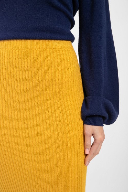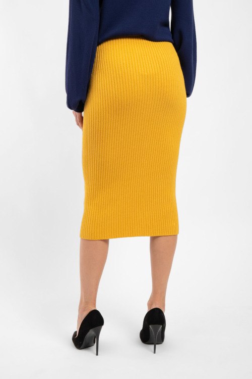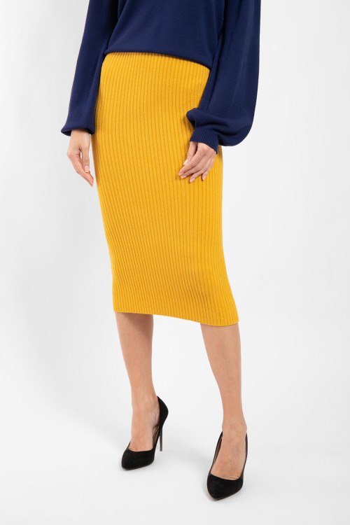 Женская горчичная юбка из вискозного микса и ангоры от Kontatto (Контатто). Длина миди, высокая посадка, эластичная резинка на поясе, облегающий силуэт, модель в рубчик, ровный низ изделия. Измерения: длина: 79 см, ширина по резинке: 33 см.