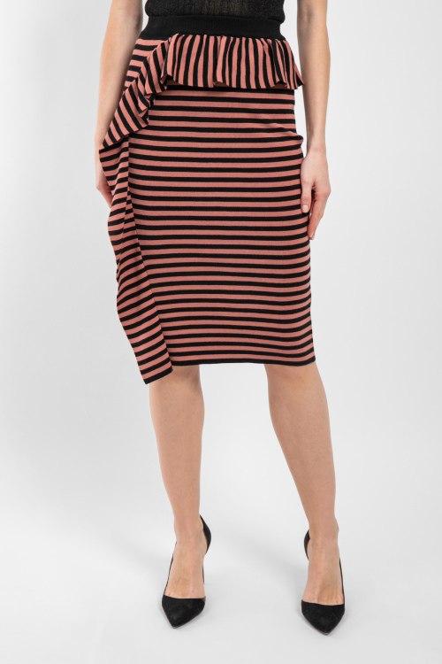 Женская коричневая трикотажная юбка от Vicolo (Виколо). Черная полоска по всей поверхности, эластичный пояс, декор оборкой, длина до колен. Замеры для размера UNI: Длина: 65 см, ширина по талии: 32 см, ширина по бёдрам: 36 см.