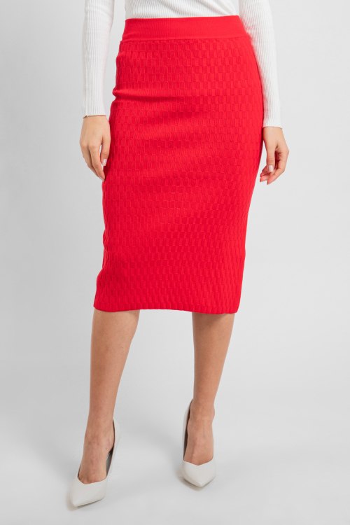 Детали: Женская красная юбка из микса вискозы и полиамида от Ermanno Scervino (Эрмано Шервино). Длина миди, однотонная модель, дизайн в виде фактурной клетки, высокая посадка, эластичная широкая резинка на поясе, ровный подол, разрез сзади.