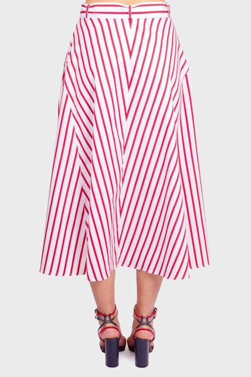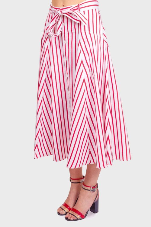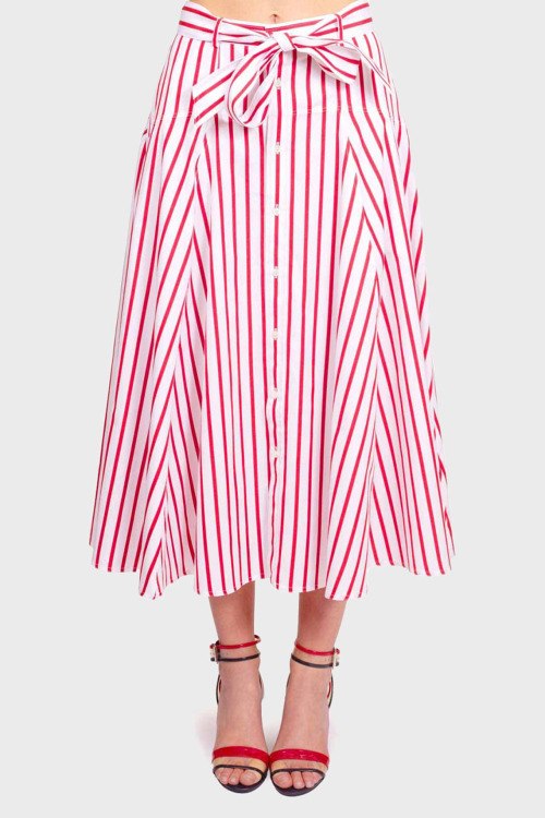 Детали: Женская бело-красная юбка из хлопка от Polo Ralph Lauren (Поло Ральф Лорен). Длина миди, высокая посадка, спереди застежка на пуговицы, пояс в тон изделия, расклешенная юбка, ровный подол