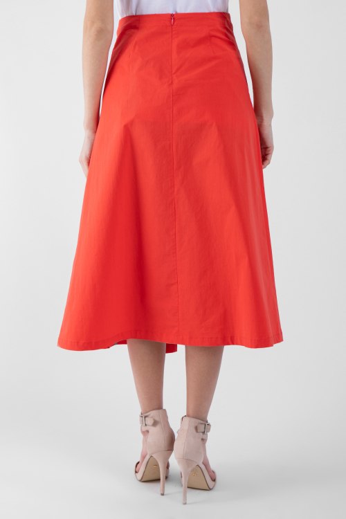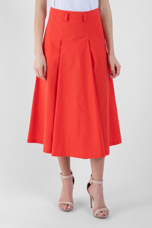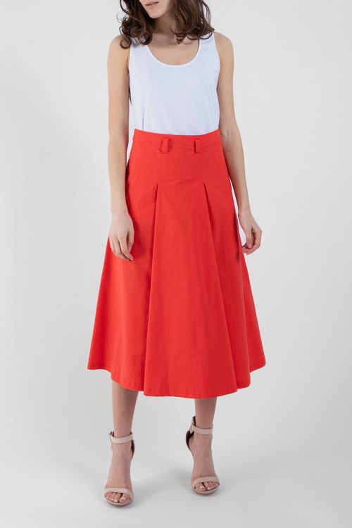 Женская коралловая юбка из хлопкового микса от NIU (Ню и). Длина миди, высокая посадка пояса, расклешенный дизайн, застежка на молнию сзади, петли для ремня, ровный низ изделия.
