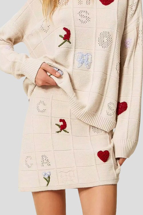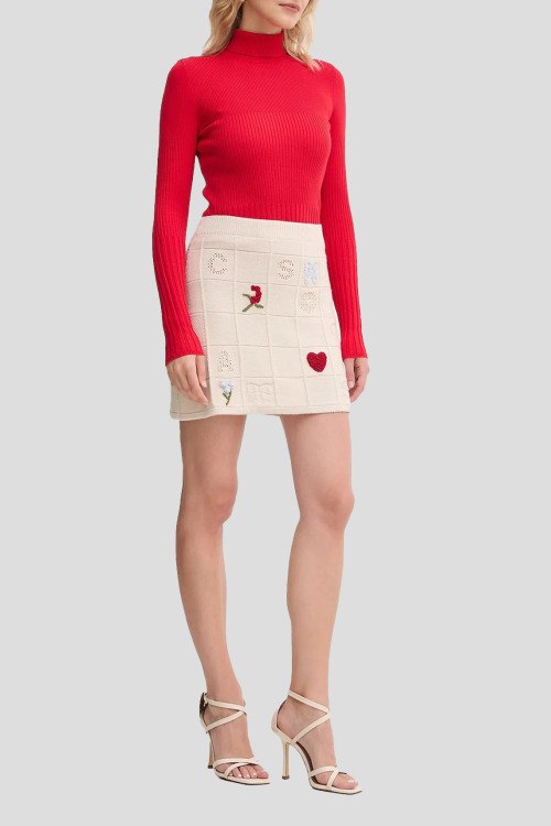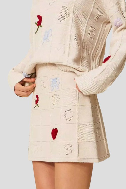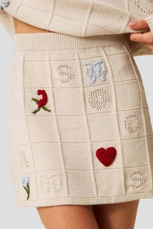 Детали: Женская кремовая мини-юбка из пряжи Treeblend от TWINSET (Твинсет). Модель с примесью шерсти и кашемира, эластичный пояс, декор вышивкой, длина-мини