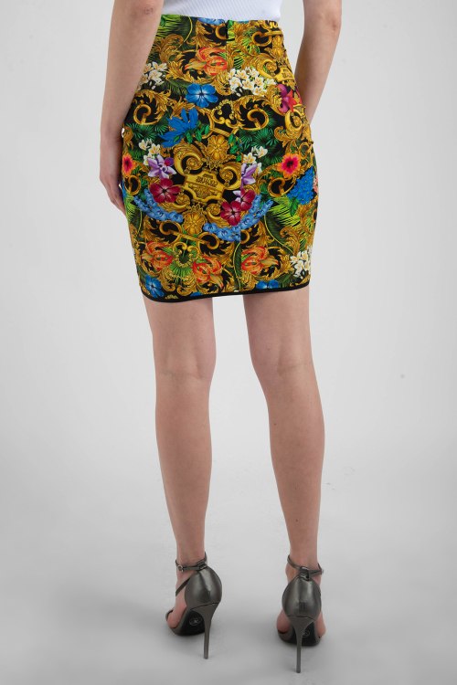 Короткая юбка. Комбинированная модель, спереди кулиска. Декорирована ярким принтом.