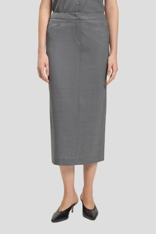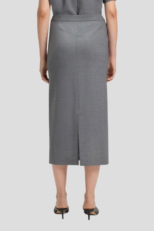 Детали: Женская серая юбка из шерсти от Hugo Boss (Хуго Босс). Длина миди, высокая посадка, застежка на молнию и крючок, сзади разрез, ровный подол