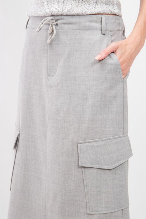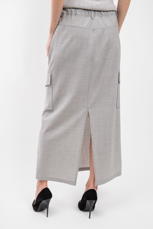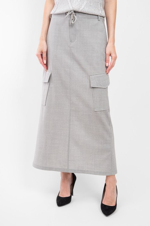 Женская серая шерстяная юбка от Panicale Cashmere (Паникале Кашемир). В поясе на завязках и с петлями для ремня, боковые карманы, накладные карманы-карго, длина-макси. На модели снят размер - 42. Параметры модели: рост 177 см, 88-62-90 см. Замеры для размера 42: Длина: 94 см, ширина по поясу: 39 см (резинка), ширина по бёдрам: 49 см.