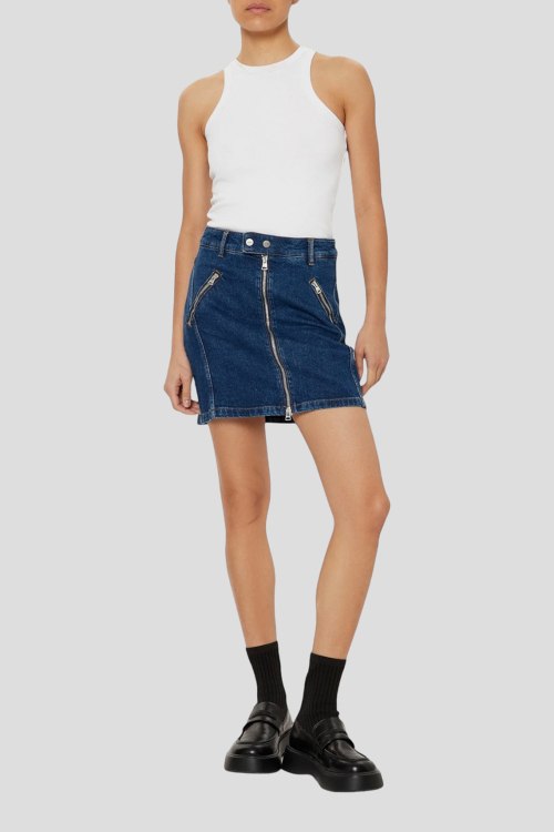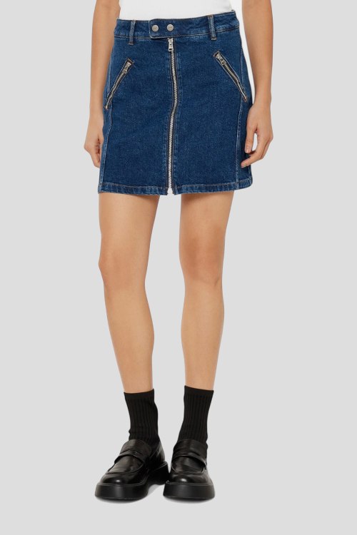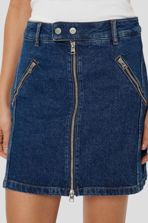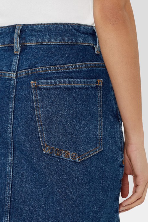 Детали: Женская синяя джинсовая юбка из хлопкового микса от Hugo by Hugo Boss (Хуго бай Хуго Босс). Короткая длина, застежка на молнию и кнопки, петли в поясе для ремня, боковые карманы на молнии, два накладных задних кармана