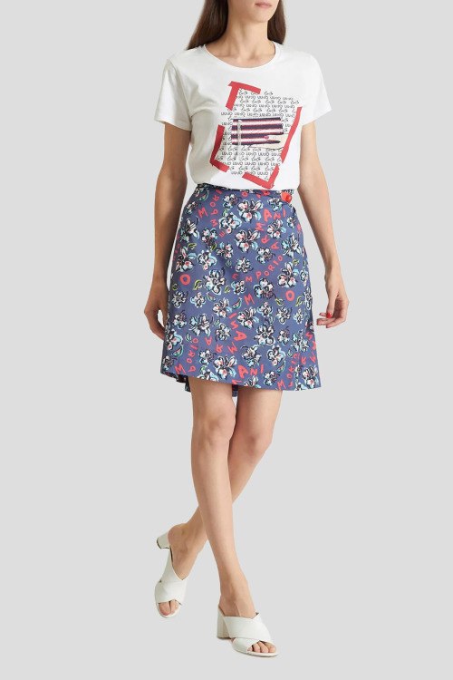 Детали: Женская синяя юбка из хлопка от Armani (Армани). Длина мини, высокая посадка, застежка на пуговицу, защипы, цветочный принт