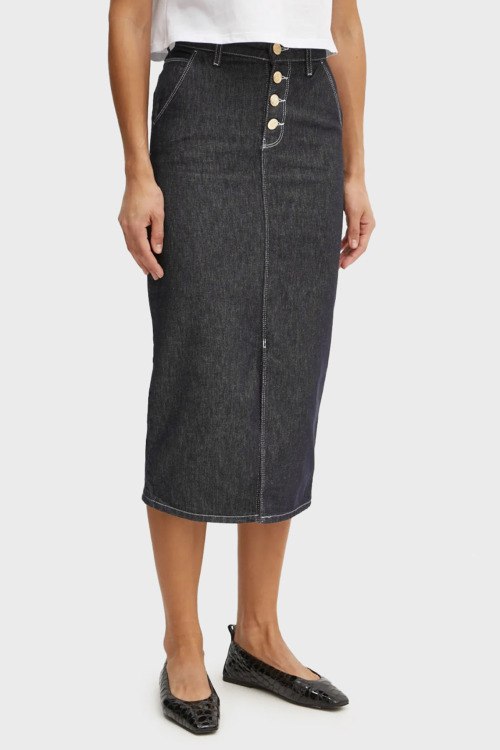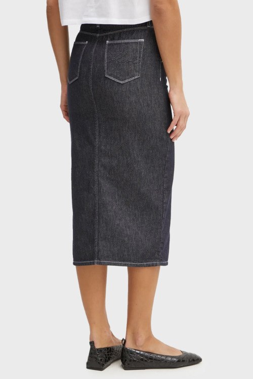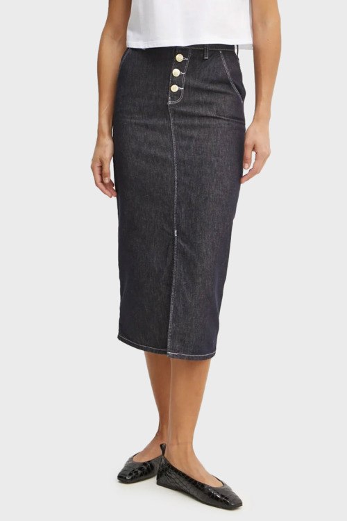 Детали: Женская темно-синяя юбка из хлопка от Karl Lagerfeld (Карл Лагерфельд). Длина миди, высокая посадка, застежка на пуговицах, ровный низ изделия, четыре кармана, петли в поясе для ремня