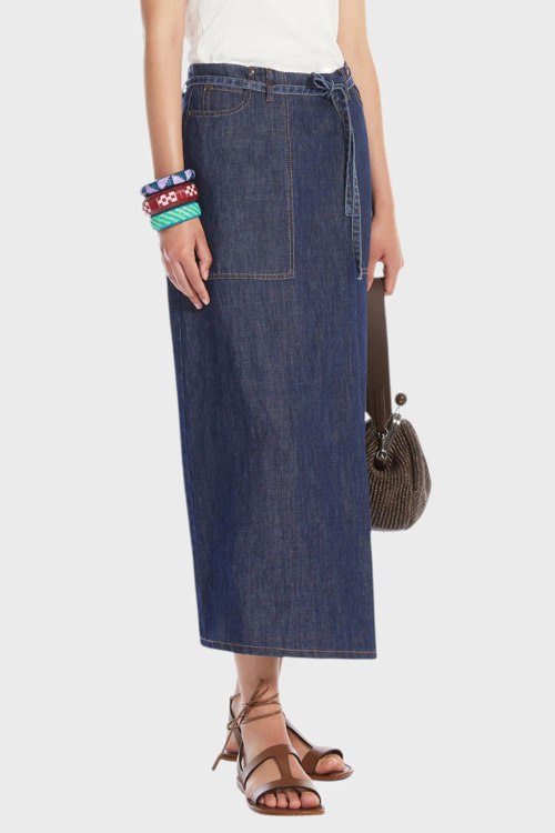 Детали: Женская темно-синяя юбка из хлопка и льна Fischio от Max Mara Weekend (Макс Мара Викенд). В поясе на завязках, боковые и задние карманы, нашивка с логотипом сзади на поясе