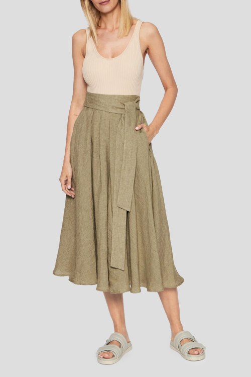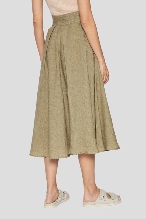 Детали: Женская оливковая льняная юбка от Fabiana Filippi (Фабиана Филиппи). Высокая талия на завязках, боковые карманы, расклешенный фасон, длина-миди