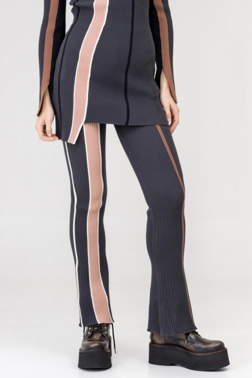 Детали: Женские графитовые брюки из хлопкового микса от Ambush (Эмбаш). Классическая длина, облегающий силуэт, высокая посадка, модель в рубчик, вертикальная полоска, эластичная резинка на поясе, расклешенный дизайн