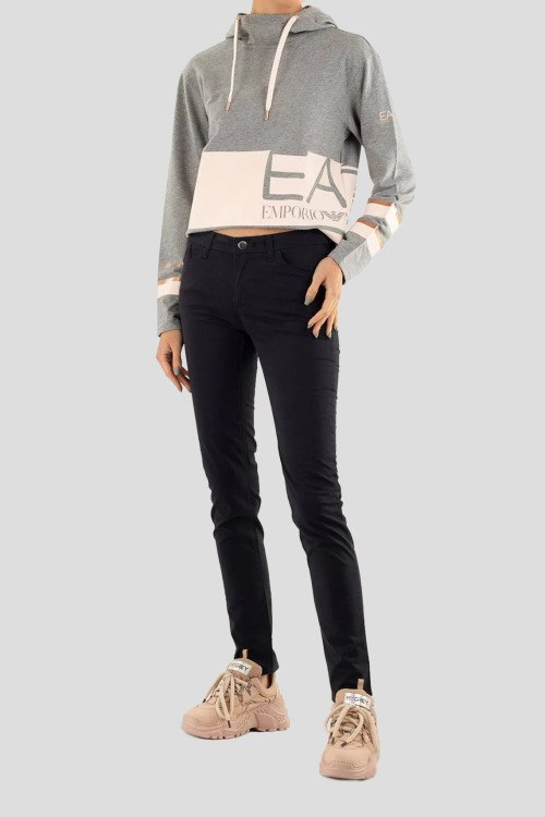 Детали: Женские темно-синие брюки из микса модала и полиэстера от Armani (Армани). Зауженная пяти-карманная модель, застежка на пуговицу и молнию, средняя посадка, петли для ремня на поясе, патч-лого, металлический логотип сзади