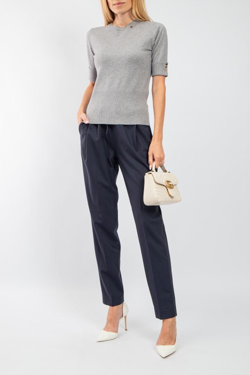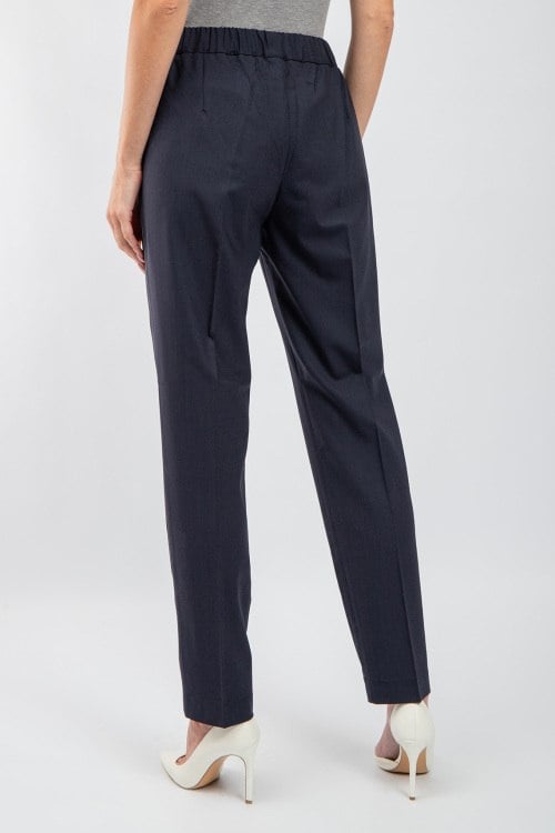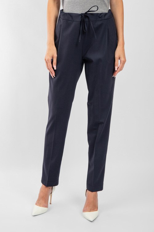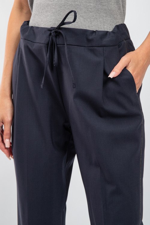 Женские темно-синие шерстяные брюки от Fabiana Filippi (Фабиана Филиппи). Дизайн с защипами и стрелками, эластичный пояс на завязках, боковые карманы, зауженный крой, полная длина. На модели снят размер - 42. Параметры модели: рост 177 см, 88-62-90 см. Замеры для размера 42: Длина изделия: 104 см, ширина по поясу: 42 см, (резинка), ширина по бедрам: 49 см, ширина штанины 31 см, высота сидения 33,5 см.